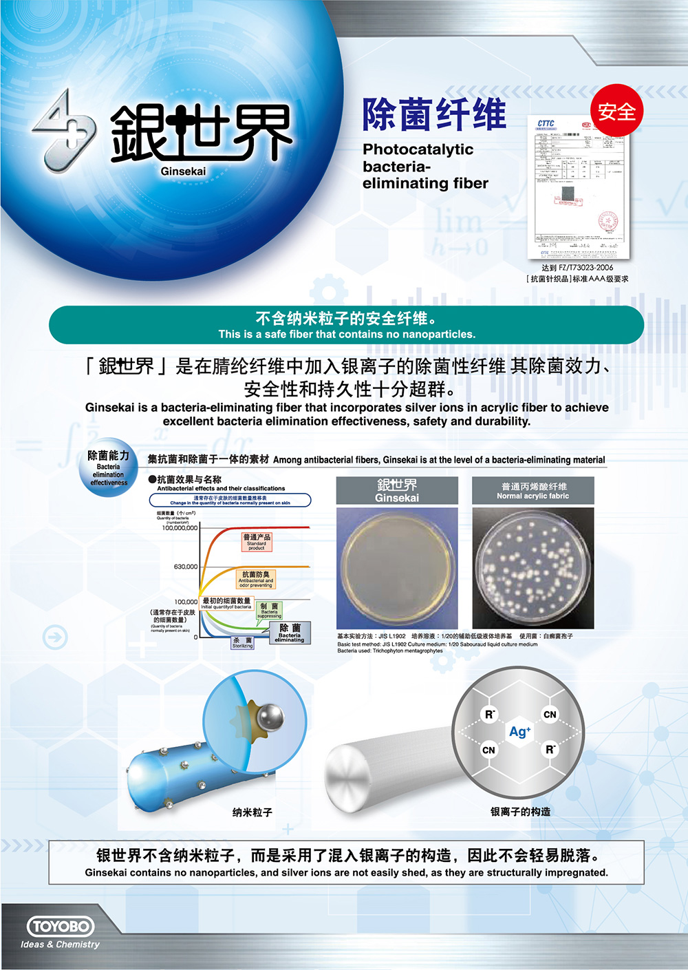 [銀世界]是在腈綸纖維中加入銀離子的除菌性纖維,其除菌效力、安全性和持久性十分超群。